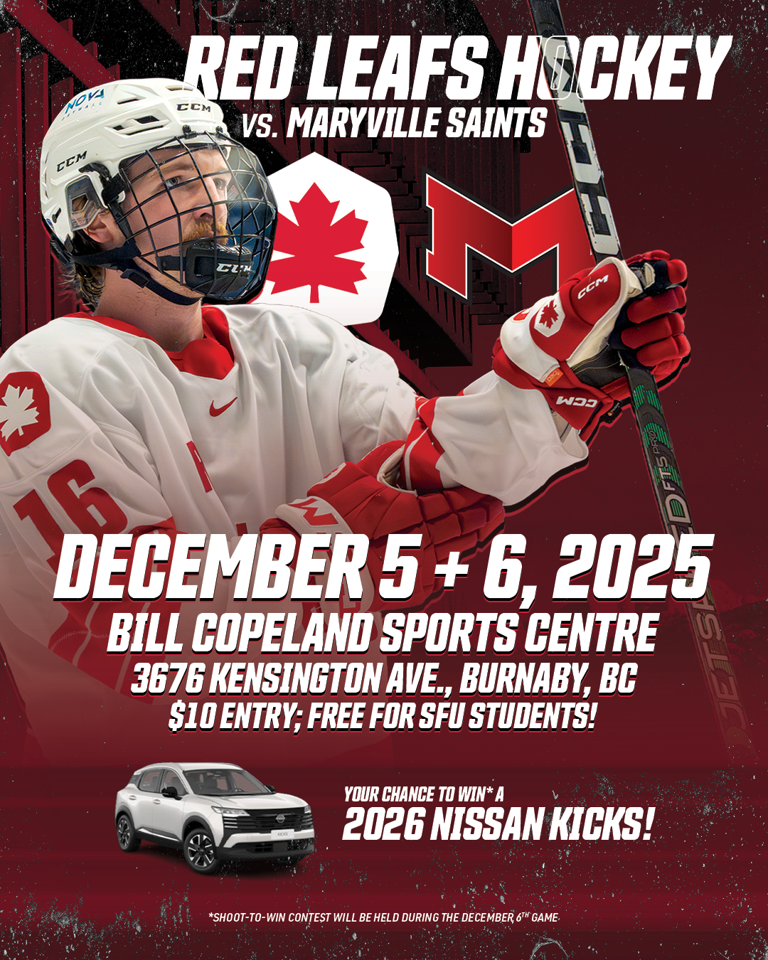 SFU now looks ahead to a pair of home games against another familiar rival in ACHA Division 1 Maryville University, taking place on December 5th and 6th at the Bill Copeland Sports Centre in Burnaby. The games will feature a Teddy Bear Toss on December 5th, and a Shoot to Win a 2026 Nissan Kicks on December 6th. Tickets are on sale now at tickets.sfuhockey.com